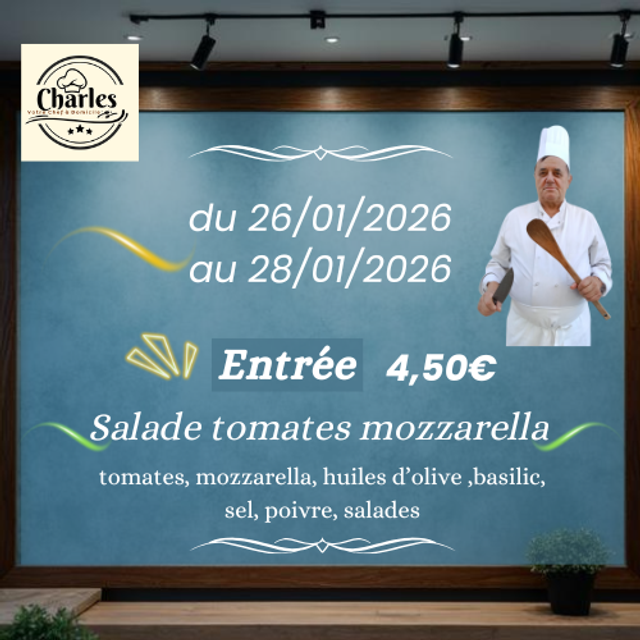 Ingrédients : tomates, mozzarella, huiles d’olive ,basilic, sel, poivre, salades.